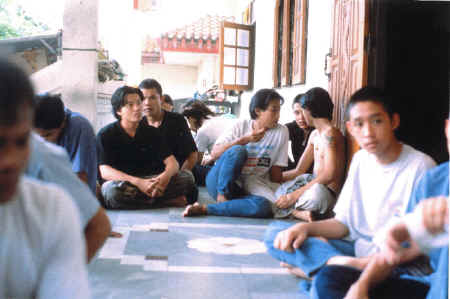A few stray dogs wander around sniffing at the corners of the room before slinking out onto the porch where a dozen young men sit in the shade waiting turn. At the end of the stone porch a younger monk decorated with running script on his shoulders and arms sits encircled by 6 youths who are preparing a design block to make a transfer. |
