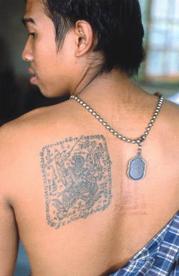 The other tattoos the men wear are cryptic- Running script on their arms and small talismans on the shoulder blades. Click