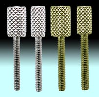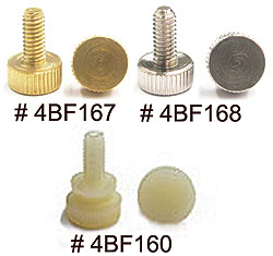 Knurled Thumb Contact Screws, 6-32 thread $ 2.50 Each # 4BF-163, Nickel Plate, Narrow Knurl # 4BF-164, Nickel Plate, Fat Knurl # 4BF-165, Brass, Narrow Knurl # 4BF-166, Brass, Fat Knurl |
